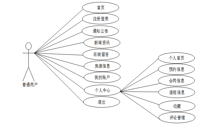 SpringBoot的公寓出租管理系统的设计与实现中普通用户包含注册登录、首页、在线留言、我的账户、新闻资讯、通知公告信息、房源信息、个人中心等功能模块,普通用户对应角色用例图如图3.1所示: