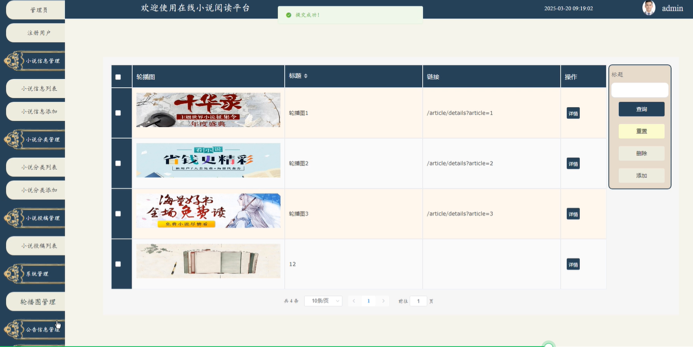 (7)系统管理:管理员可以通过系统管理模块管理平台的基础设置。例如,管理员可以管理首页的轮播图,上传、删除或修改轮播图内容,确保平台首页展示的内容符合最新需求,保持页面的动态和吸引力。