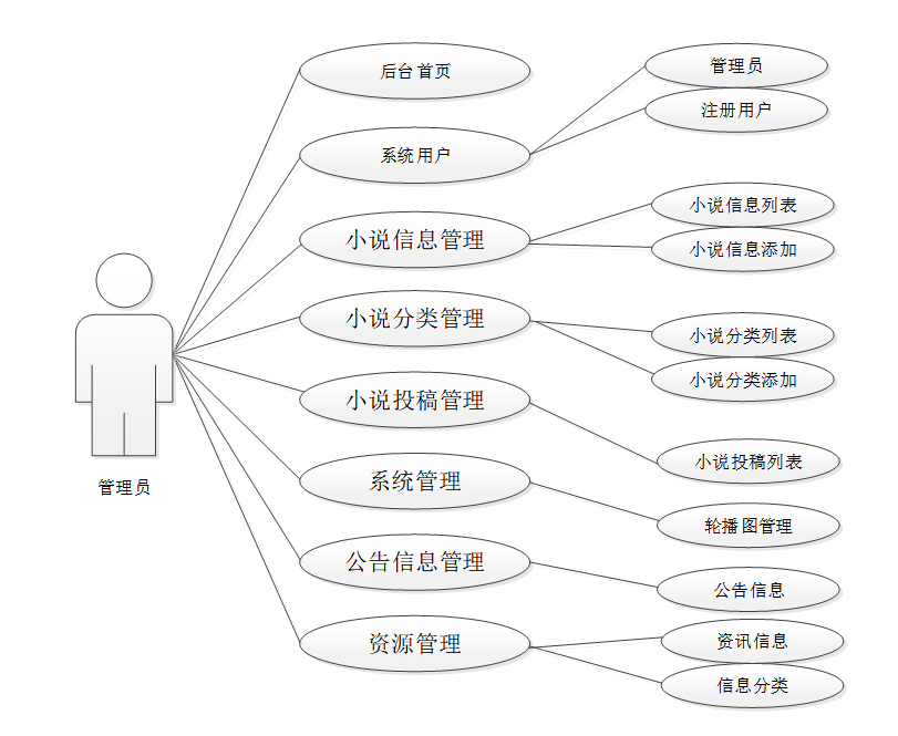 在线小说阅读平台系统中,管理员的主要功能包括后台首页、系统用户、小说信息管理、小说分类管理、小说投稿管理、系统管理、公告信息管理、资源管理等功能。管理员用例图如下所示: