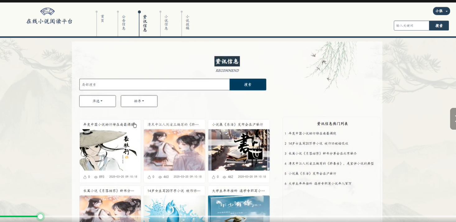 (5)资讯信息:查看平台发布的最新小说相关资讯,包括行业动态、作家访谈、小说推荐等。用户可以对资讯进行点赞、收藏、发表评论。