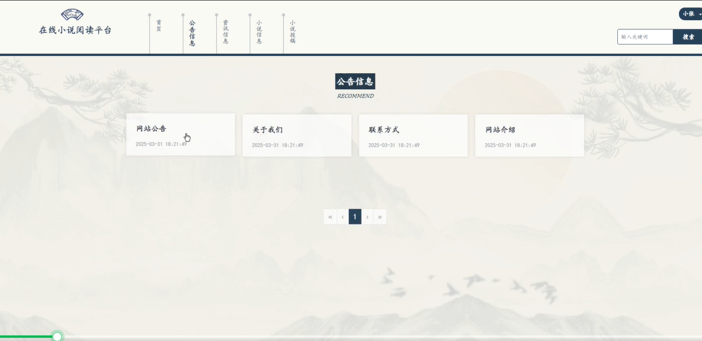 (6)小说信息:用户可以浏览平台上的小说,包括各类小说的详细信息、章节目录和更新情况。支持按分类、作者、关键词进行搜索,方便用户查找感兴趣的小说。