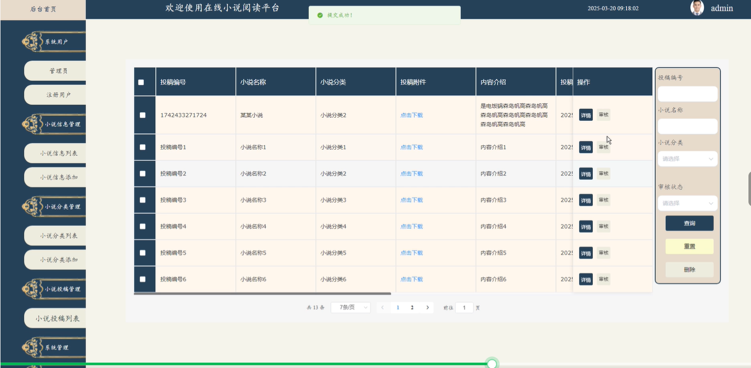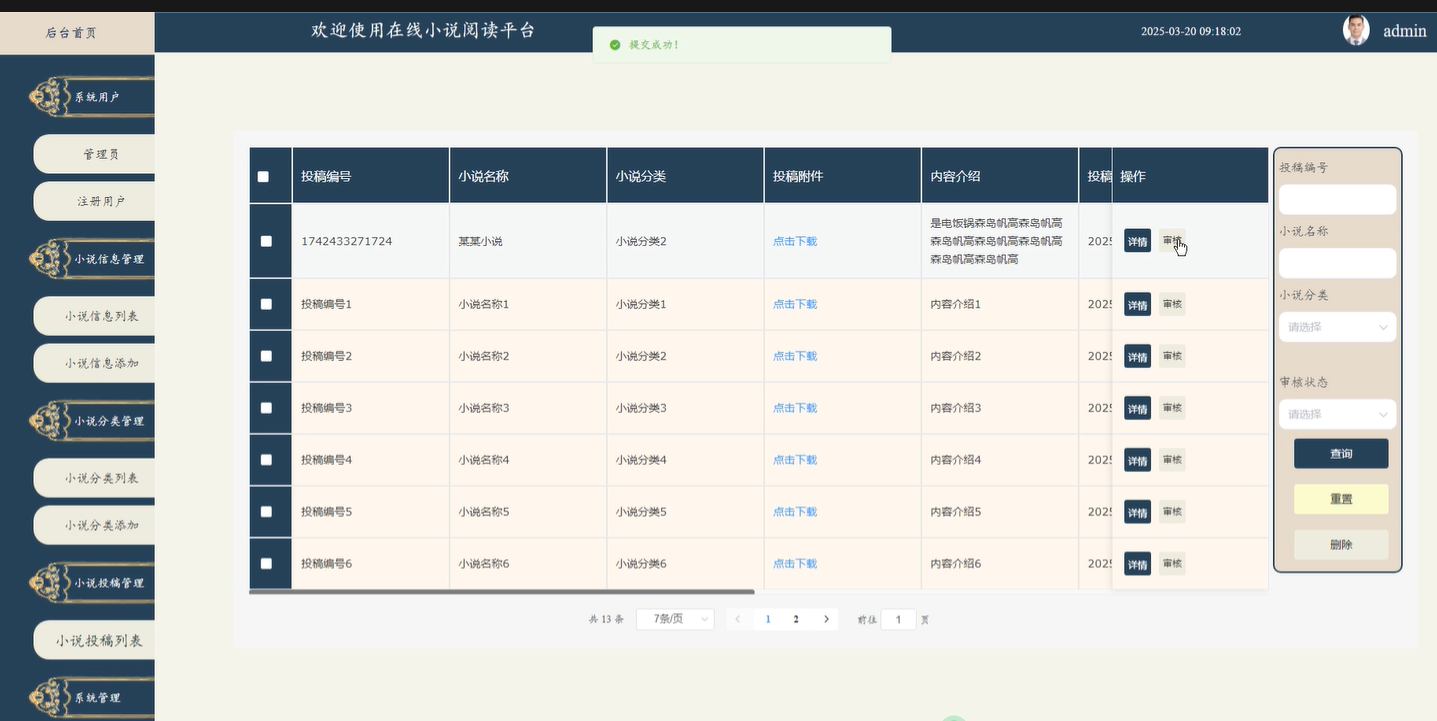(6)小说投稿管理:在小说投稿管理模块,管理员可以查看用户提交的小说投稿。每一篇小说都需要经过管理员的审核,确保内容符合平台的规范和质量标准。管理员审核通过后,小说将正式发布在平台上,让更多用户可以阅读。