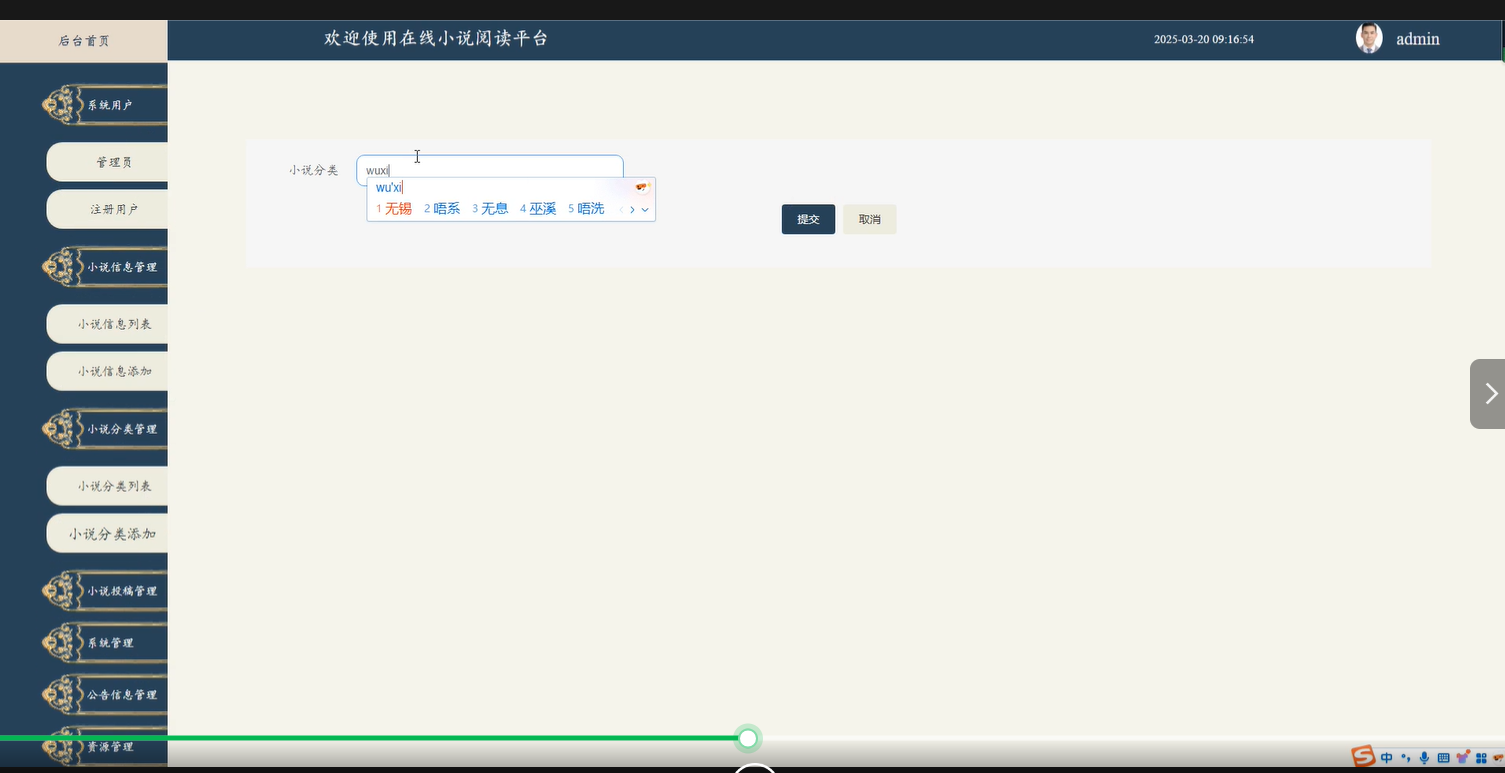 (5)小说分类管理:管理员可以查看平台上现有的小说分类,方便管理平台小说的展示与筛选功能。如果需要,管理员还可以添加新的小说分类,以便细化管理小说内容,满足不同读者的需求,提升用户体验。