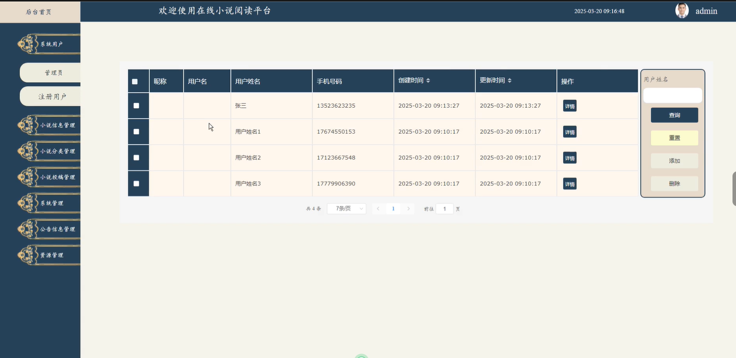 该平台的操作界面设计简洁、用户友好,使用流畅。普通用户、创作者和管理员均可轻松上手,无需复杂培训。平台采用模块化设计,涵盖小说信息管理、评论互动、用户管理、推荐算法等核心功能,用户可以迅速完成阅读、评论和创作等操作。管理员可在后台管理用户、小说、评论等信息,有效提升内容管理和运营效率。平台支持多角色操作,根据不同角色的权限分配相应功能,确保了各类用户的操作权限清晰且安全。此外,平台的界面和操作流程经过优化,能够提供直观的导航和愉悦的阅读体验,增强了用户的参与感和互动性。