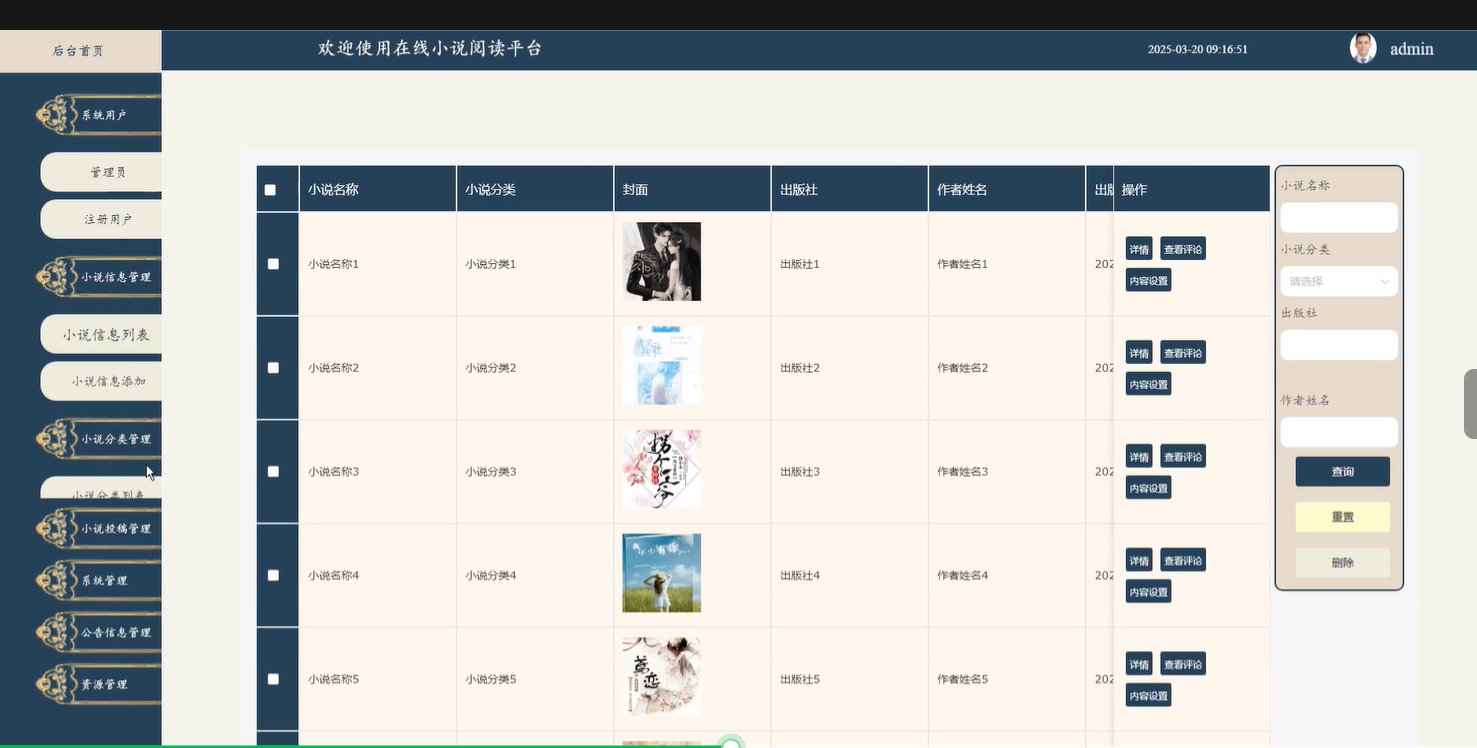 | 预期结果 | 管理员可以成功查看、编辑和删除小说信息,新增的小说信息能正确显示在平台上并经过审核后发布。 |