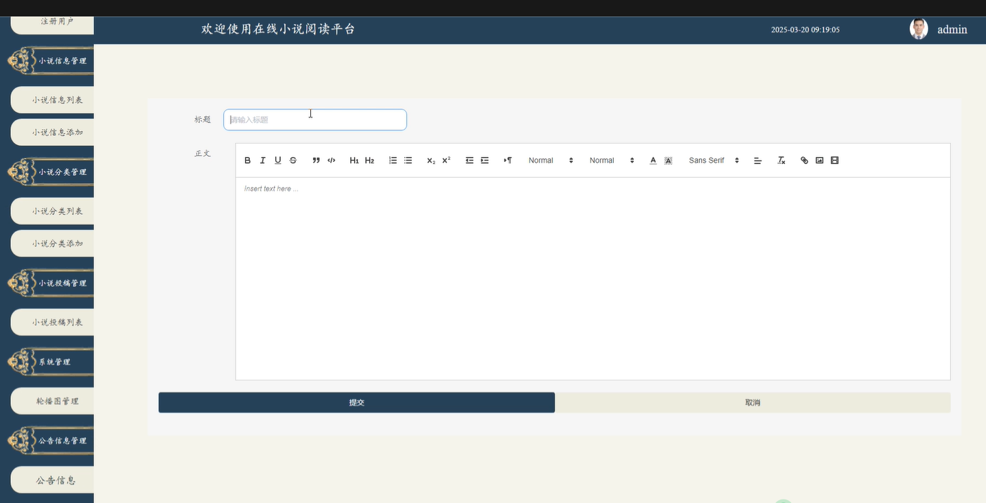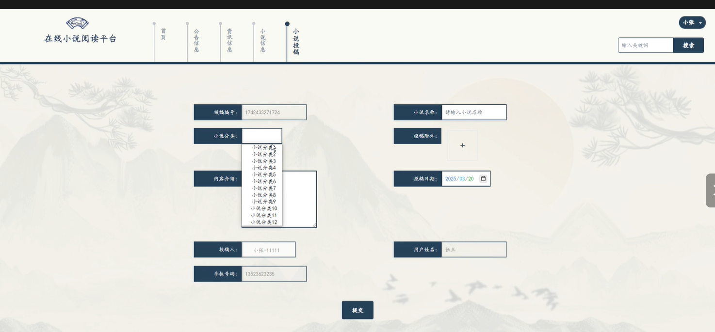 2)小说投稿:用户可以投稿自己的小说。提交的小说需要管理员审核,审核通过后才能在平台展示。