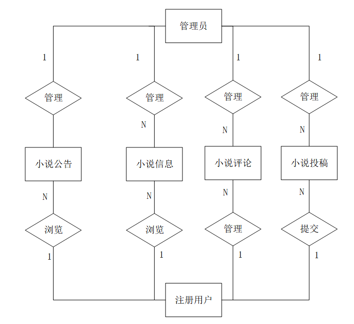 在线小说阅读平台的概念设计借助 E-R 图,可以直观地展示平台中各个功能模块之间的关系,帮助用户快速理解系统的结构及其相互联系。系统中的主要实体包括:管理员、注册用户、小说信息、小说分类、小说评论、公告信息、资讯信息、轮播图、用户反馈、小说投稿、收藏信息和评论管理。这些实体之间通过各种关联关系(如一对多、多对多等)进行相互连接,形成了平台的核心功能模块。通过 E-R 图,管理员可以管理用户、小说信息及评论;注册用户可以进行小说浏览、收藏、评论和参与互动;系统公告和资讯信息用于平台通知和内容推广,确保平台的实时更新与信息传达。E-R实体关系图。
