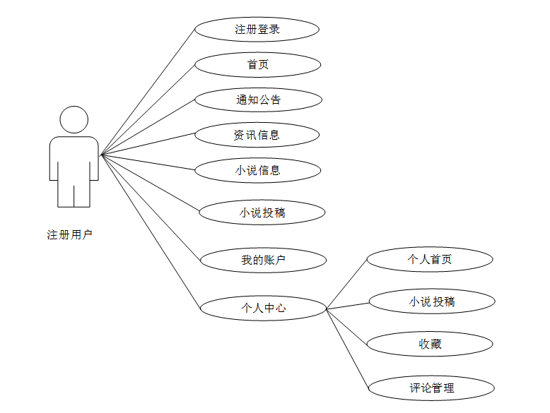 在在线小说阅读平台系统中,注册用户的主要功能包括用户注册、登录、首页、公告信息、资讯信息、小说信息、小说投稿、我的账户、个人中心等功能,注册用户用例图如下所示: