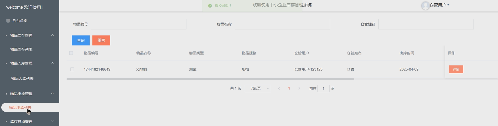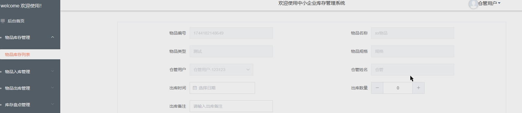 - 物品出库管理:仓管用户进行物品的出库操作,根据销售订单或需求,合理管理出库过程。系统实时更新库存数据,并确保出库信息的准确性和可追溯性。