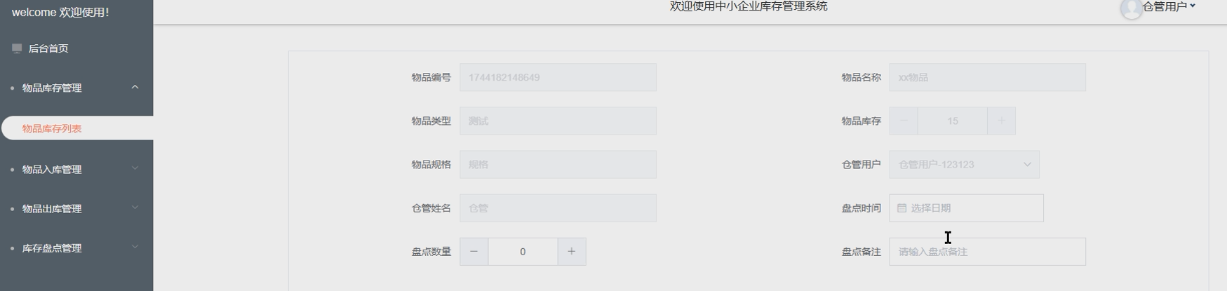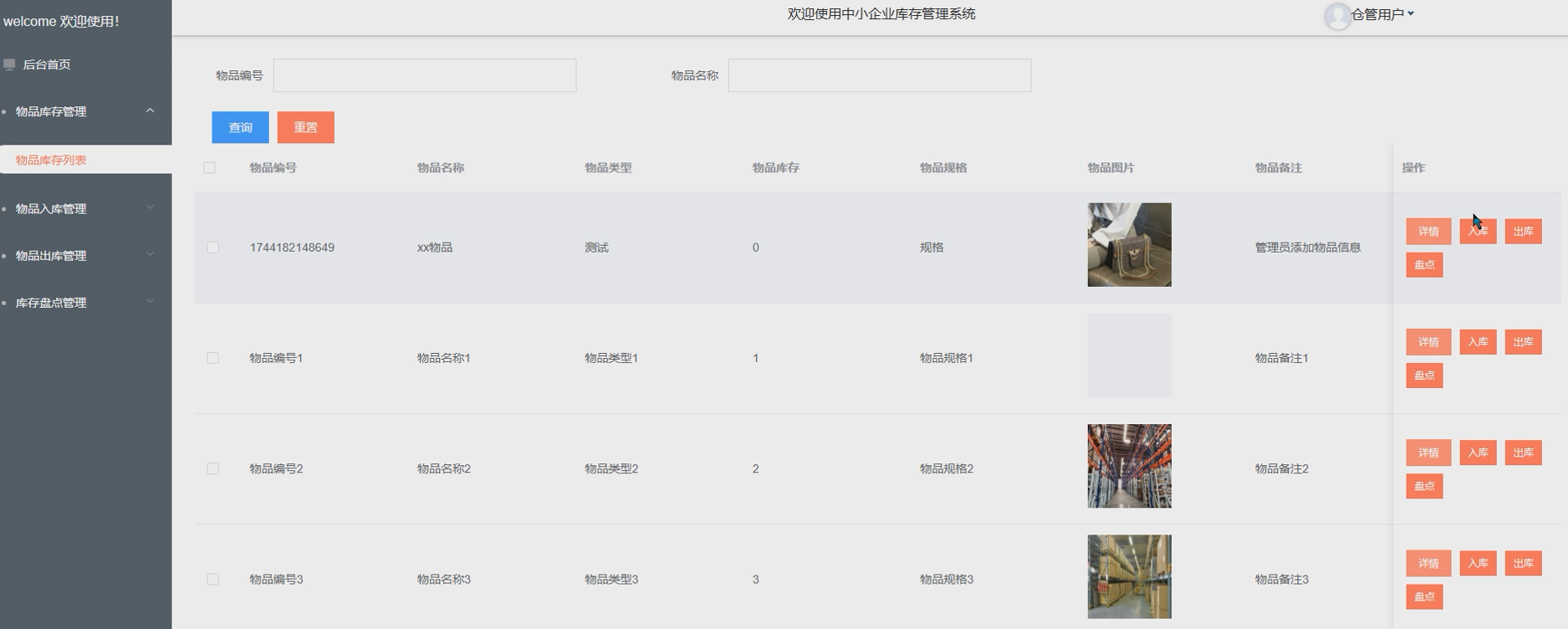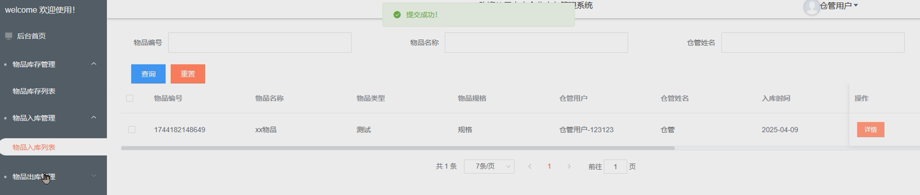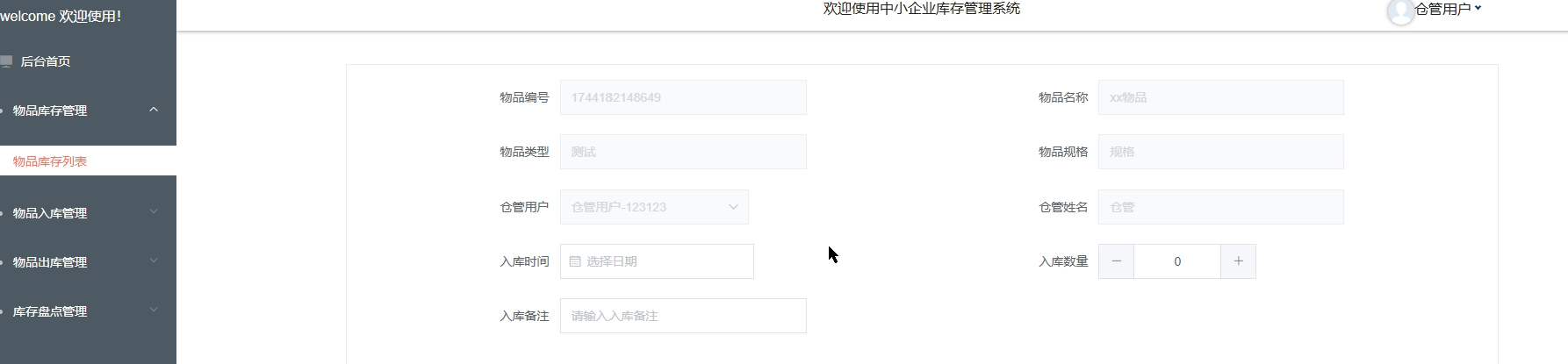 - 物品入库管理:仓管用户负责物品的入库操作,输入物品信息并更新库存数量。确保物品入库信息的准确记录,避免库存混乱。
