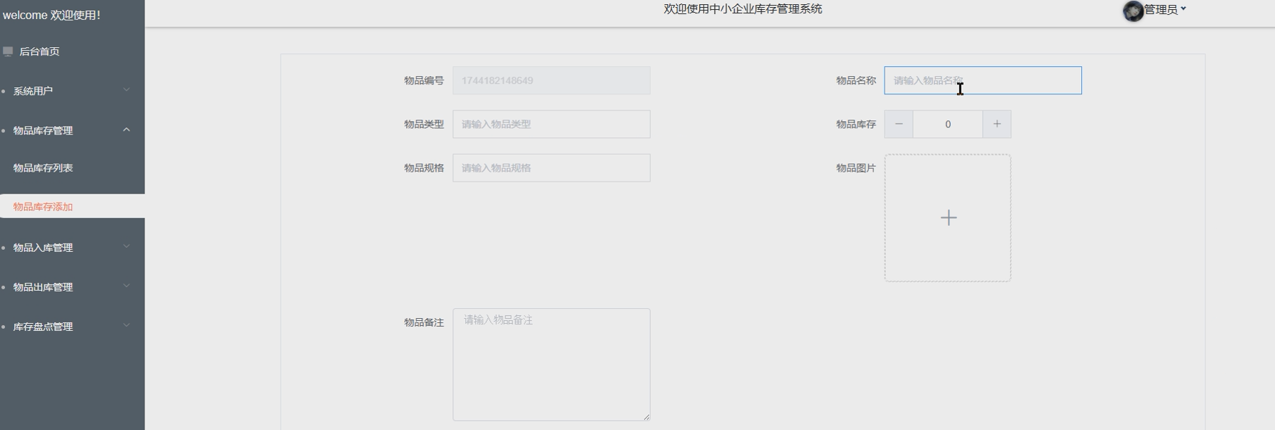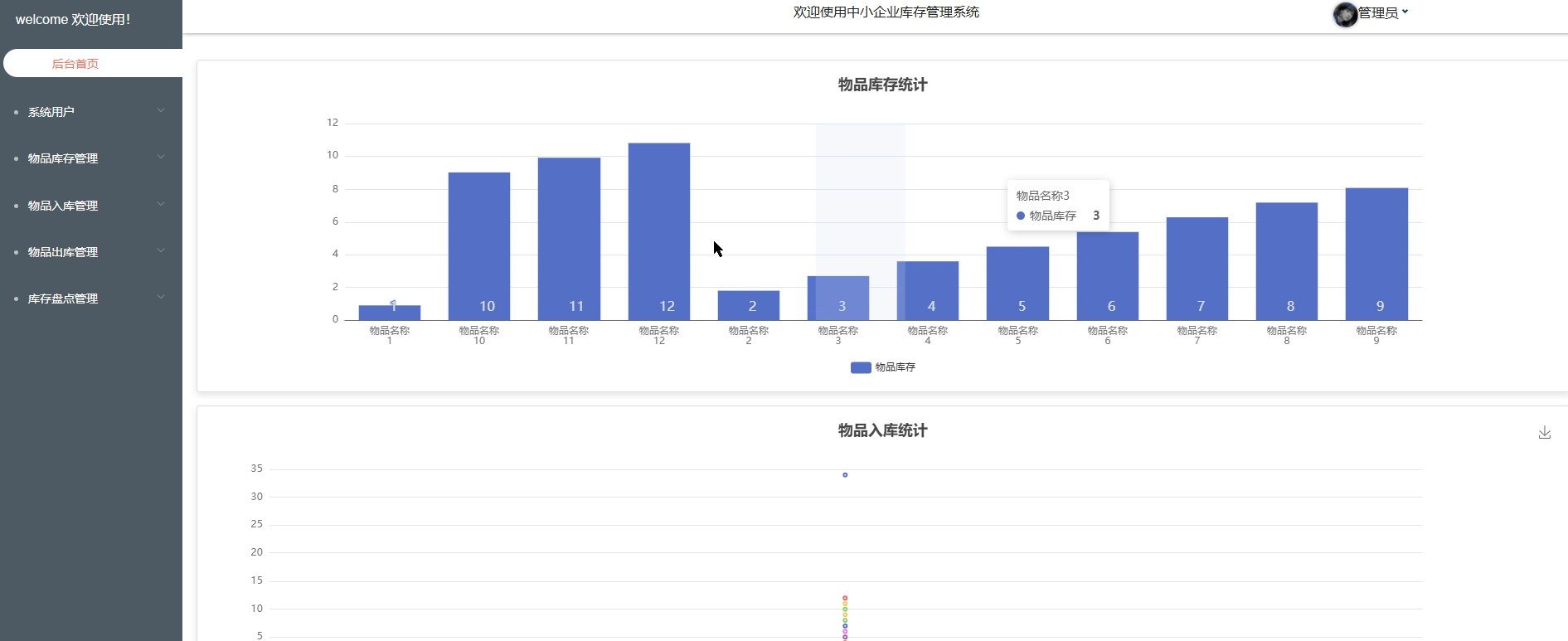 - 后台首页:管理员登录后进入后台首页,首页展示系统的核心数据统计,包括物品库存统计和物品入库统计。通过可视化的图表和数据,管理员可以快速了解库存状况、入库情况和业务趋势,便于做出及时决策。