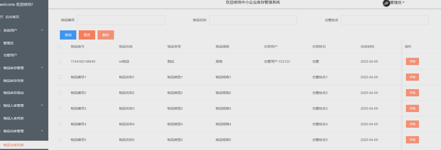 管理员可对出库记录进行监控与管理,确保物资流转合理。支持查看所有出库明细,包括物品编号、物品名称、物品规格、出库时间等信息。系统自动记录每次出库操作并更新库存,方便追踪和审计。物品出库管理界面如下图所示。