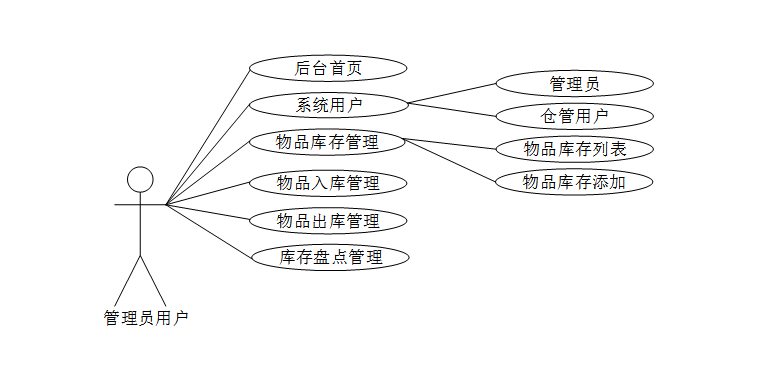 中小企业库存管理系统中管理员包含后台首页、系统用户(管理员、仓管用户)、物品库存管理(物品库存列表、物品库存添加)、物品入库管理、物品出库管理、库存盘点管理等功能。用例图如下所示: