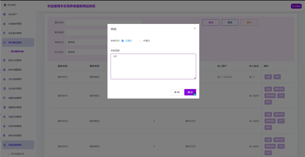 预约服务: 查看预约服务的详情,包括服务类型、状态、审核结果等,支持搜索、查询和重置。