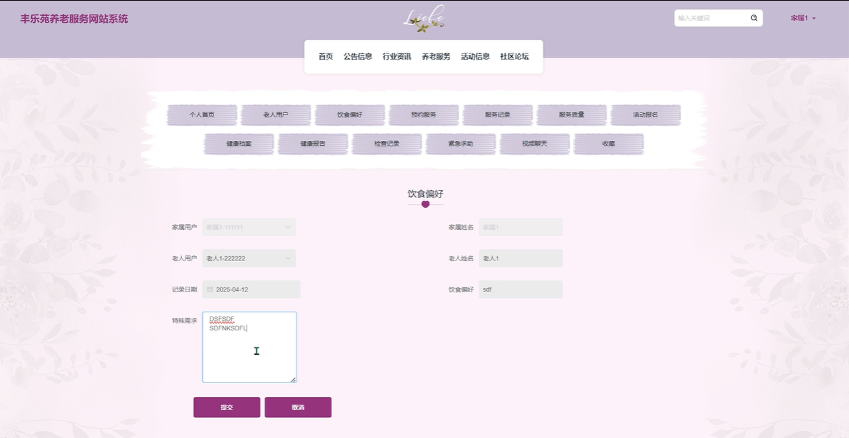 饮食偏好管理: 查看、查询和重置老人用户的饮食偏好,支持添加和删除饮食偏好的设置。