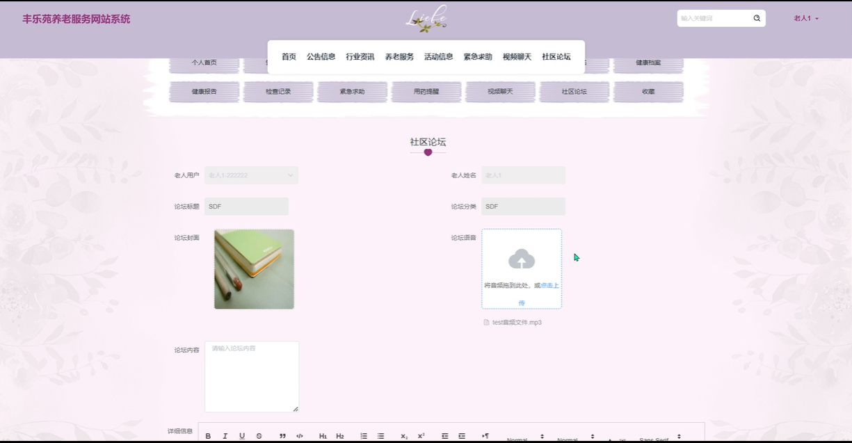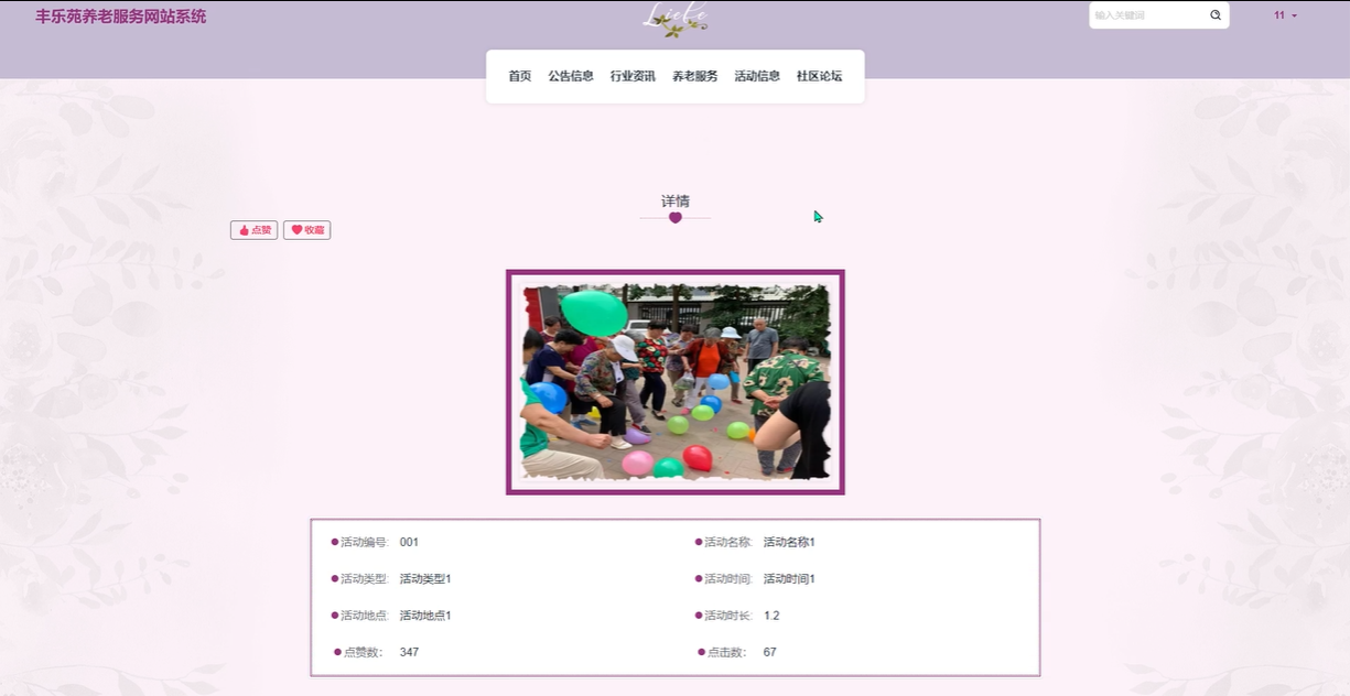 活动信息: 查看活动详情,包括活动名称、时间、地点等,支持点赞、收藏、评论、回复等操作,老人可以报名参与活动。