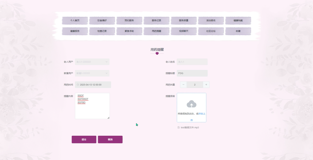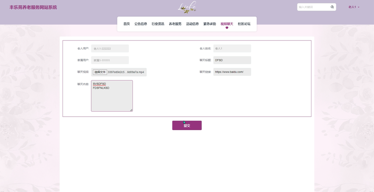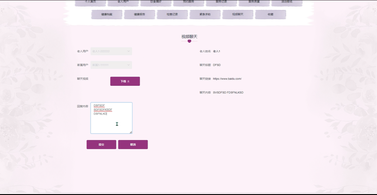 视频聊天: 提供视频聊天功能,老人用户可以进行语音视频交流,支持上传聊天视频、发送聊天内容等操作。