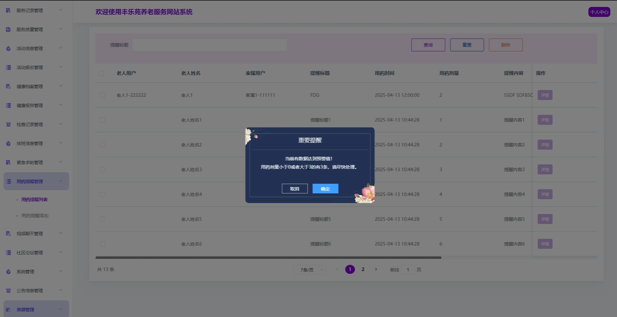 老人用户管理: 查看和查询老人用户的基本信息,支持重置密码等操作。