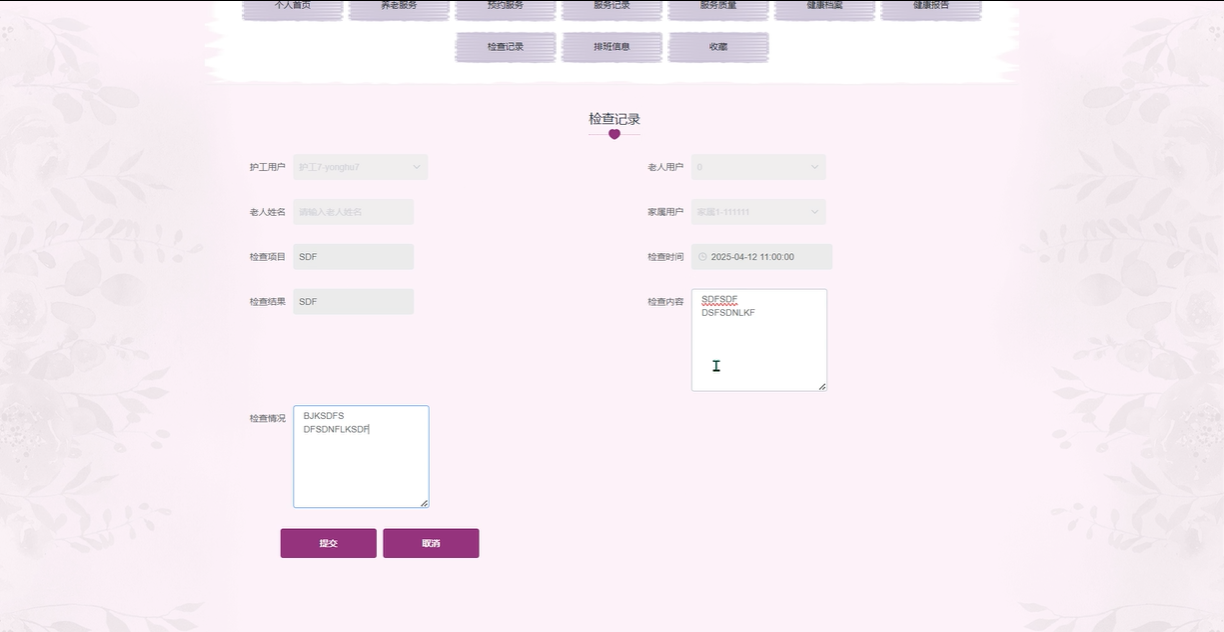 检查记录: 查看检查记录,支持查询和重置操作,确保老人健康数据实时更新。