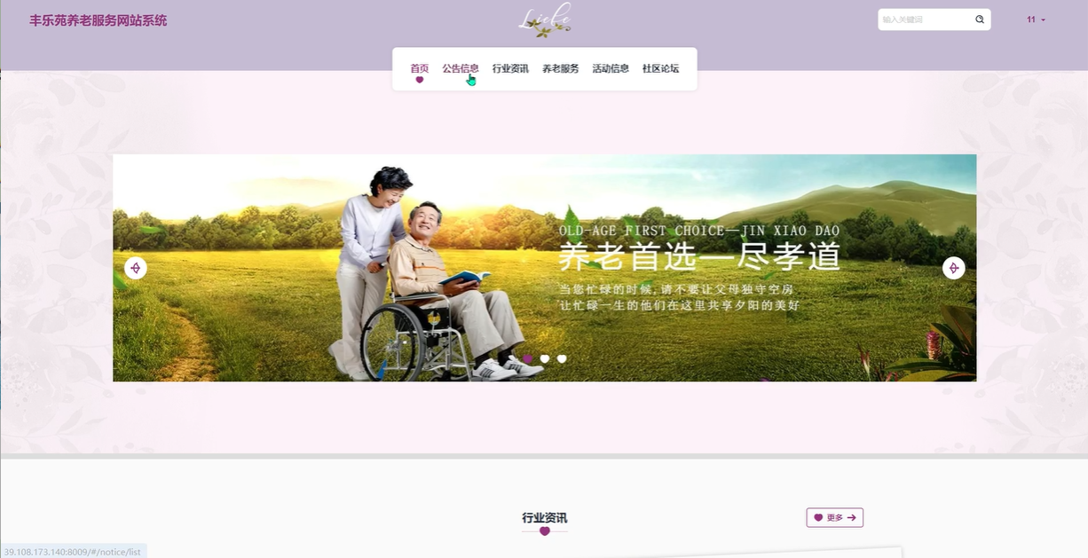 首页: 显示轮播图、网站公告、行业资讯、活动信息推荐、搜索功能及导航栏,帮助家属用户快速了解最新动态和活动信息。