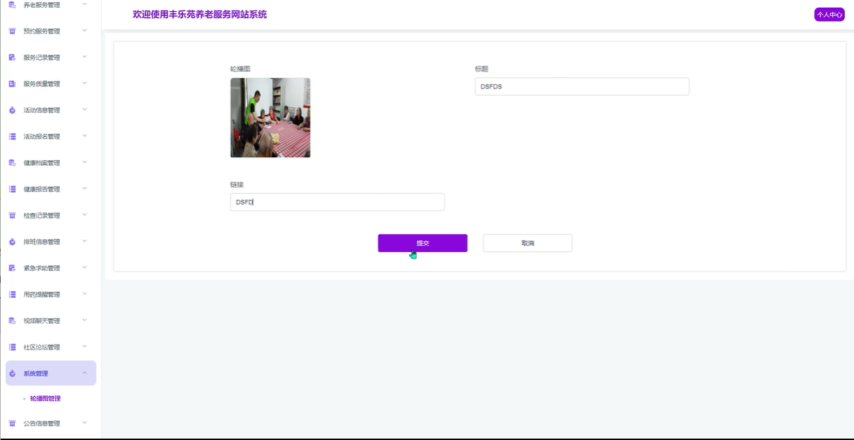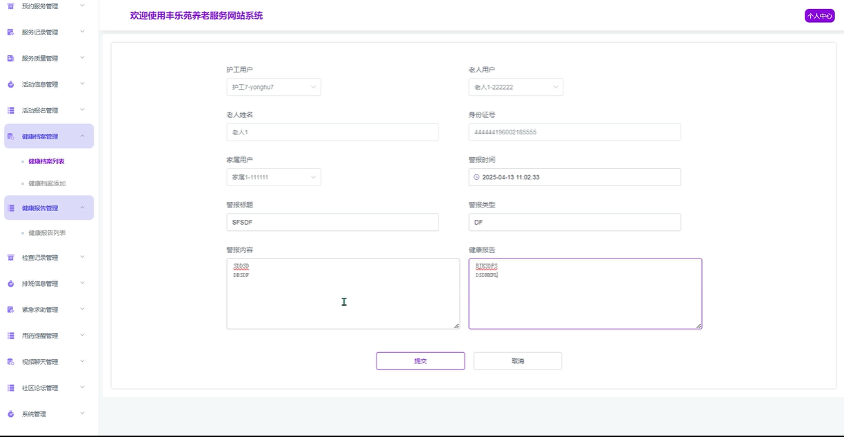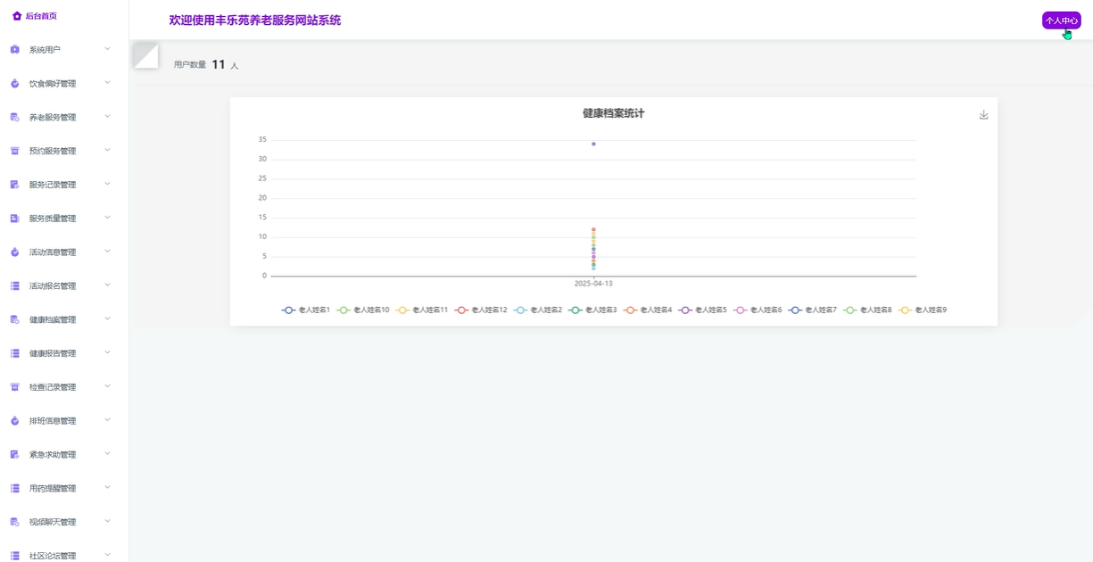 个人首页: 提供个人首页,老人用户可查看服务记录、活动报名、健康档案等重要信息。