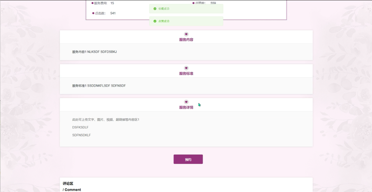 养老服务: 查看服务详情,包括服务名称、类型、费用、图片等,支持点赞、收藏、评论、回复等功能,老人可以选择预约。
