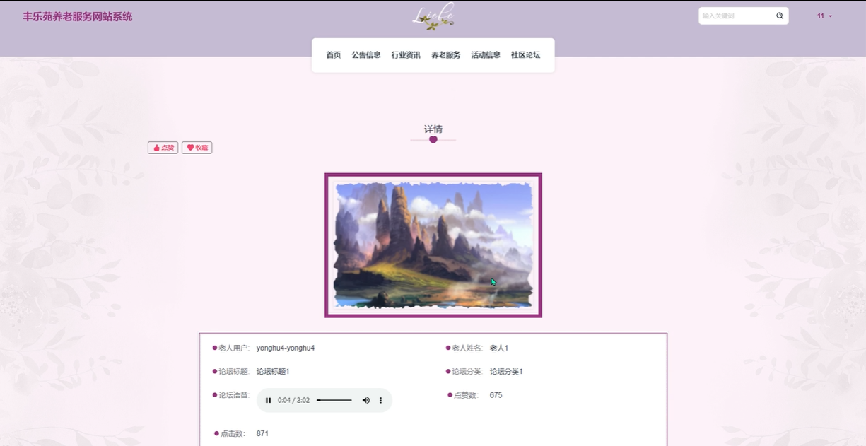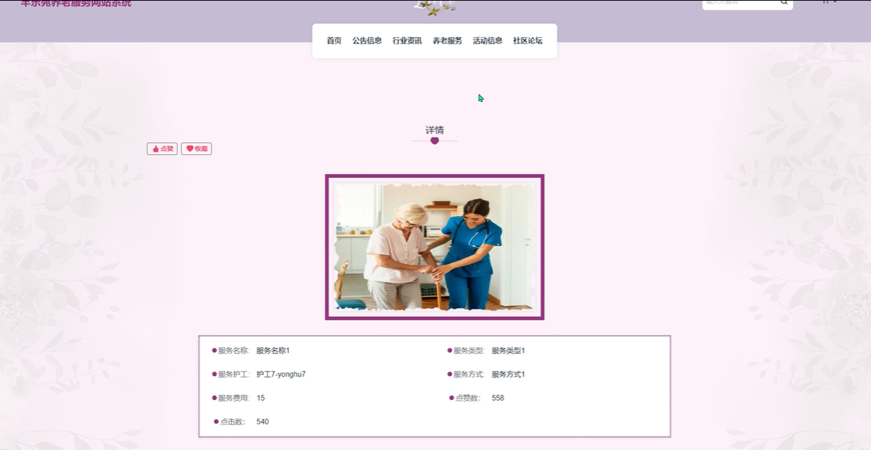养老服务: 查看养老服务详情,包括服务名称、类型、方式、图片及费用等,支持搜索、点赞、收藏、评论、回复、删除等操作。