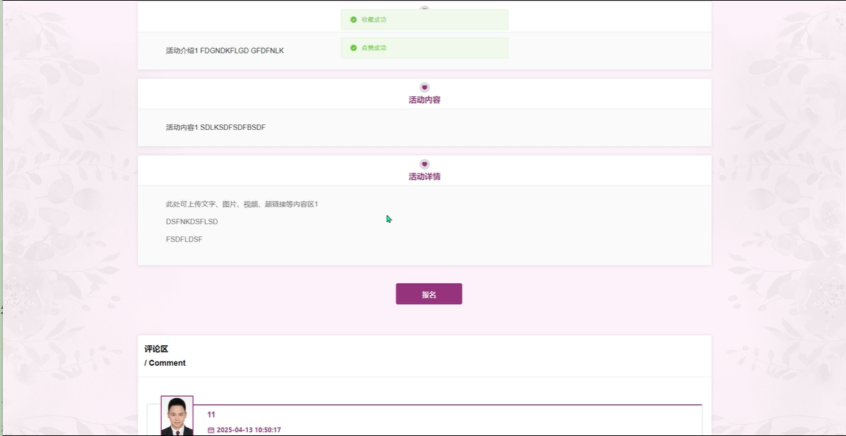 活动信息: 查看活动的详细信息,包括活动名称、类型、时间、地点、图片等,支持搜索、点赞、收藏、评论、回复、删除等操作。