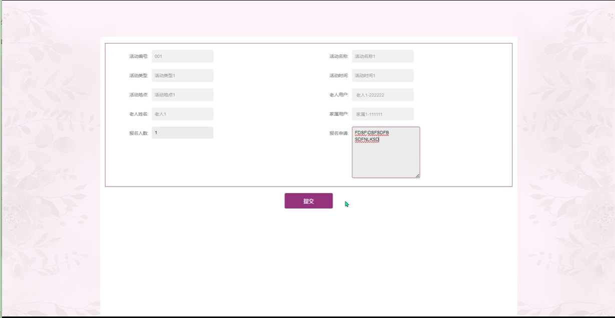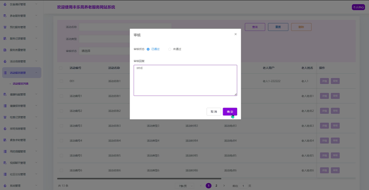 活动报名: 查看老人参与的活动报名情况,跟踪活动审核状态,支持查询和重置。