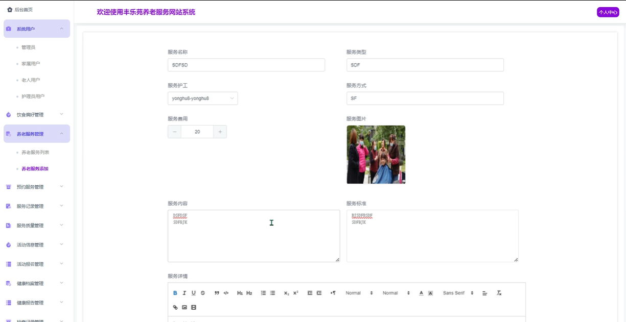 The backend management function of the system is powerful, supporting administrators to effectively manage elderly information, service projects, appointment status, etc. Based on the efficiency and flexibility of the SpringBoot framework, the system can quickly respond to user requests, ensuring a smooth user experience. In order to ensure the security and privacy of data, the system adopts advanced encryption technology to ensure that the information of the elderly and their families is not threatened. Through this system, Fengleyuan's elderly care services can better meet the growing needs of the elderly and improve the quality and efficiency of elderly care services.