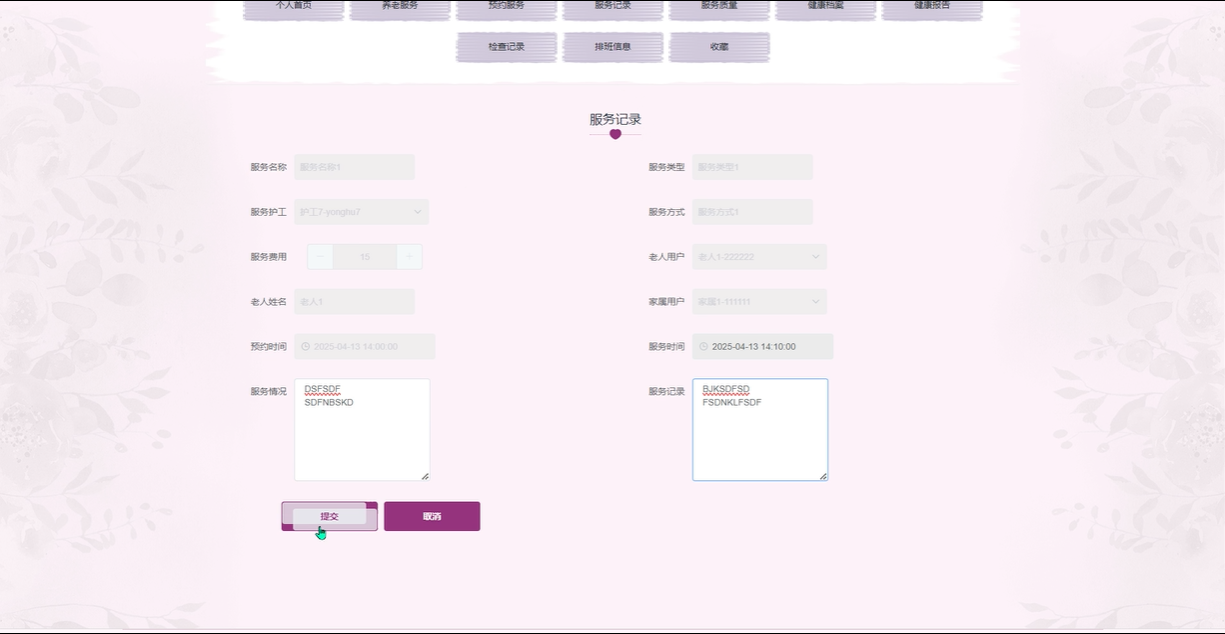 服务记录: 查看老人用户的服务记录,进行服务历史的查询和重置。