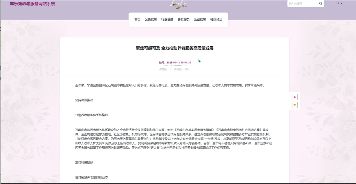 行业资讯: 可以查看养老行业的新闻资讯,进行搜索、点赞、收藏、评论、回复、删除等操作,保持信息的互动性。