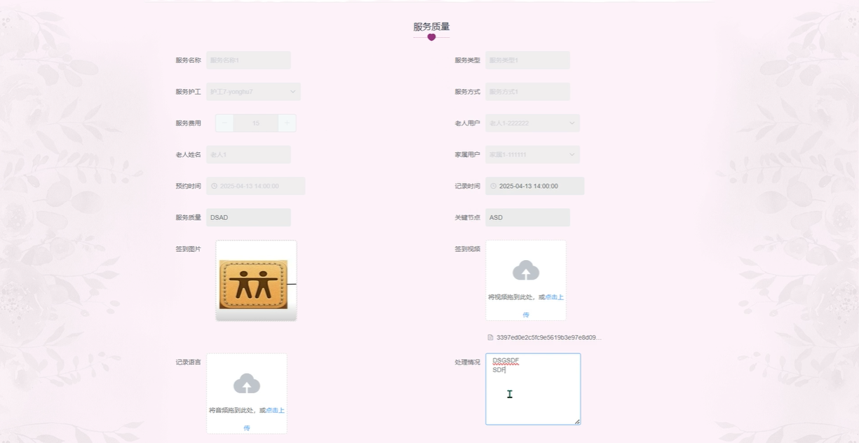 服务质量: 查看老人用户的服务质量反馈,支持搜索、查询、重置等操作。