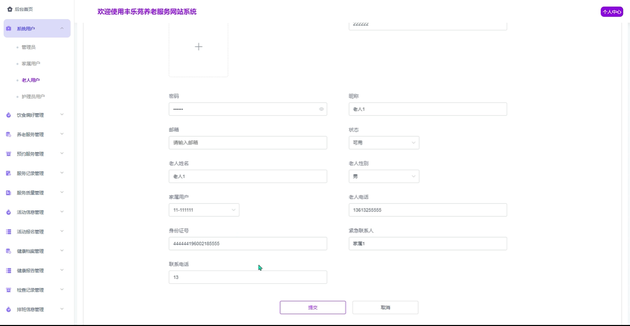登录: 老人用户可以通过管理员添加个人账号进行登录,查看相关服务和健康信息。