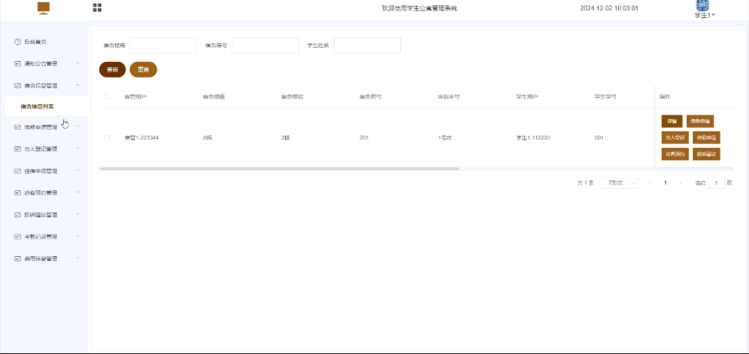 本项目旨在引入信息化技术设计和实现一套功能全面和安全性高的学生公寓管理系统,为高校学生公寓管理提供一个可操作的解决方案,满足学校日常业务管理和用户多元需求,提升管理效率和用户体验。基于SSM的学生公寓管理系统的开发,通过信息化手段提高学生公寓管理的自动化水平,简化管理流程,提升整体工作效率。通过建立信息共享平台,打破信息孤岛,提供高效的服务,提高宿舍管理的透明度和信息流通效率,提升用户体验。同时,利用Shiro框架实现安全的用户身份验证与权限控制,确保各类用户在系统中安全、规范地进行操作,加强安全管理,保障信息安全。通过系统化的数据统计功能,帮助管理者及时掌握公寓运行状态,做出数据驱动的决策,提升管理的科学性。此外,本研究不仅可以更好地解决当前学生公寓管理中的诸多问题,也为高校管理的数字化转型提供实践参考,推动高等教育管理的现代化进程,有助于校内管理的持续优化。综上所述,本研究不仅满足了实际应用的需要,也在理论上为相关领域的研究提供了新的视角和思路,具有重要理论价值和实践意义。