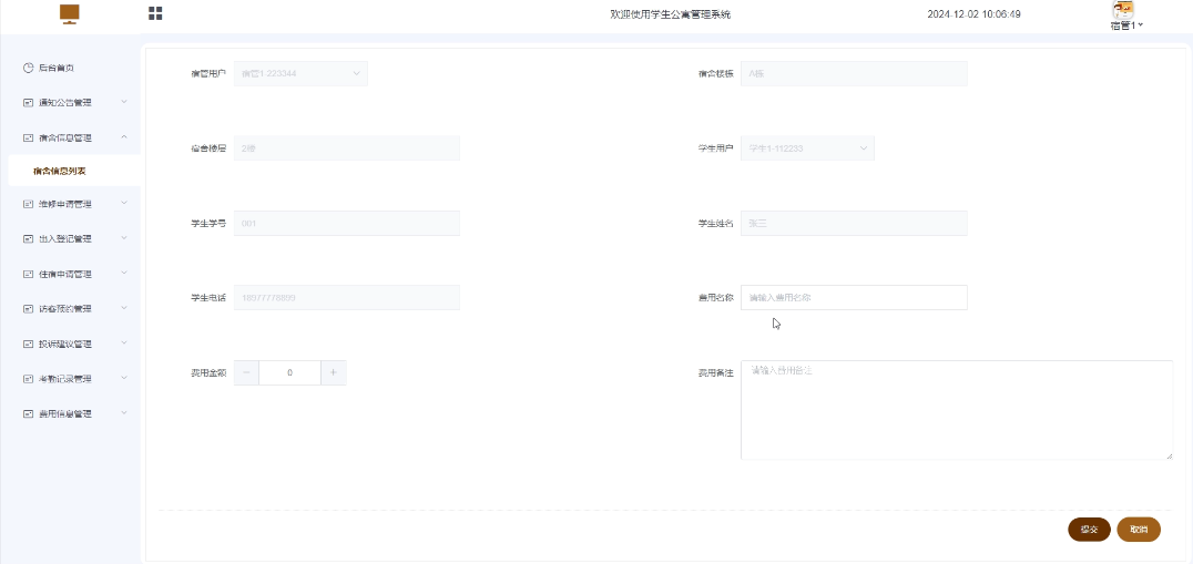 - 费用信息管理:宿管用户可以查阅自己添加的费用信息信息,支持浏览和更新费用信息的详细内容。