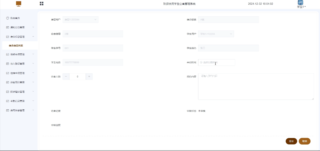 - 访客预约管理:学生用户可以查阅和添加自己的访客预约信息,确认访客预约信息的审核情况。