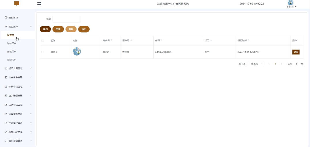 - 通知公告管理:宿管用户可查阅和管理通知公告信息,支持宿管用户发布通知公告,及更新、删除通知公告。