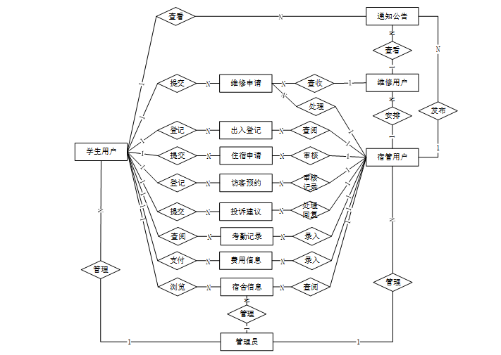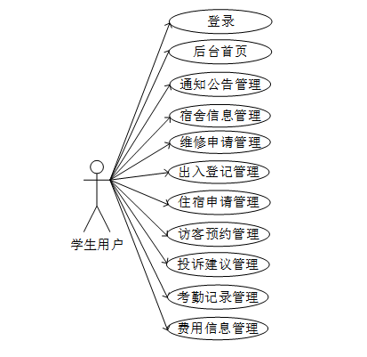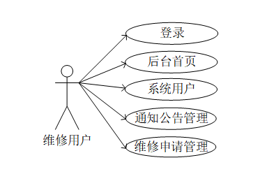 根据使用该系统的用户角色可以划分为学生用户、宿管用户、维修用户和管理员,其中管理员是系统最高权限拥有者,负责维护和管理系统。