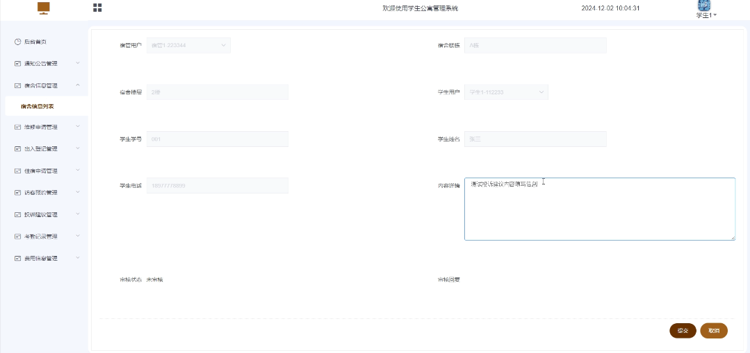 | TC005 | 验证投诉建议审核功能 | 1. 登录宿管用户帐户。2. 进入投诉建议管理界面。3. 点击审核,更新审核状态及回复。4. 点击提交。 | 投诉建议审核成功,审核状态更新 | 与预期一致 |