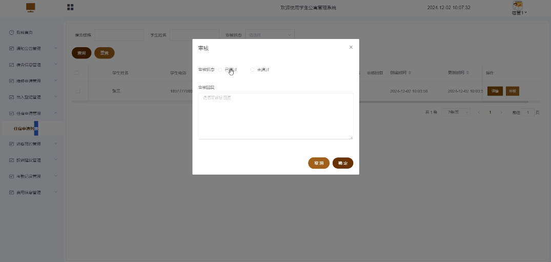 | TC005 | 验证住宿申请审核功能 | 1. 登录宿管用户帐户。2. 进入住宿申请管理界面。3. 点击审核,更新审核状态及回复。4. 点击提交。 | 住宿申请审核成功,审核状态更新 | 与预期一致 |
