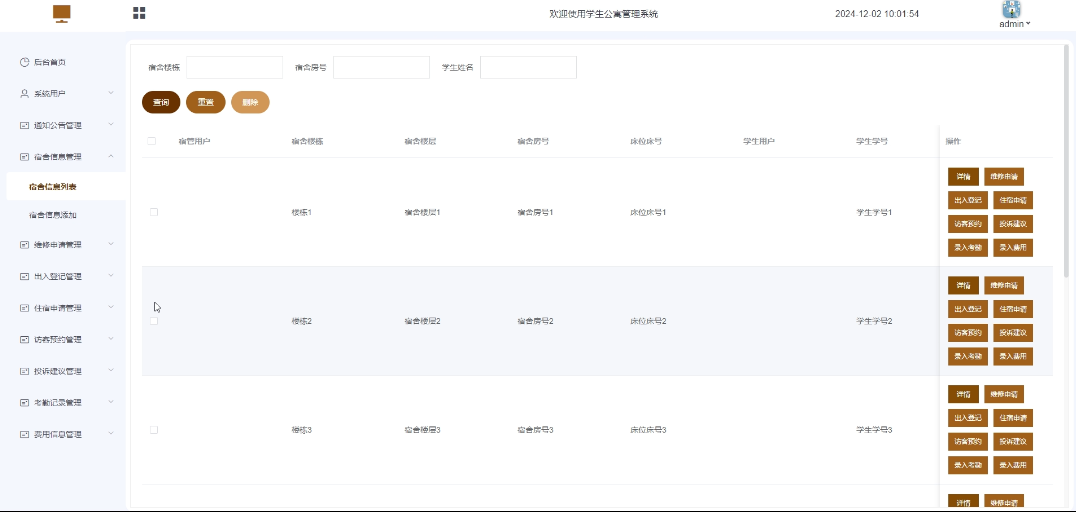 - 宿舍信息管理:学生用户可以查阅宿舍信息,浏览宿舍信息详细内容,提供维修申请、出入登记、住宿申请、访客预约、投诉建议等操作。支持学生提交维修申请、出入登记、住宿申请、访客预约等申请信息,并可进行投诉建议。