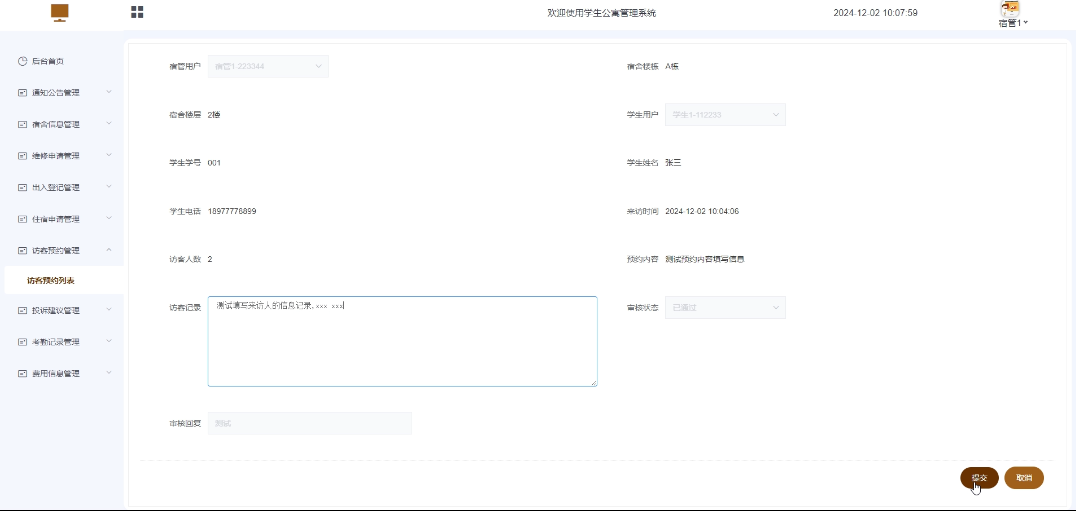 | TC005 | 验证访客预约审核功能 | 1. 登录宿管用户帐户。2. 进入访客预约管理界面。3. 点击审核,更新审核状态及回复。4. 点击提交。 | 访客预约审核成功,审核状态更新 | 与预期一致 |