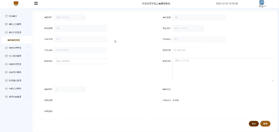 - 维修申请管理:学生用户可以查阅和添加自己的维修申请信息,确认维修申请的审核情况,跟踪维修进度。