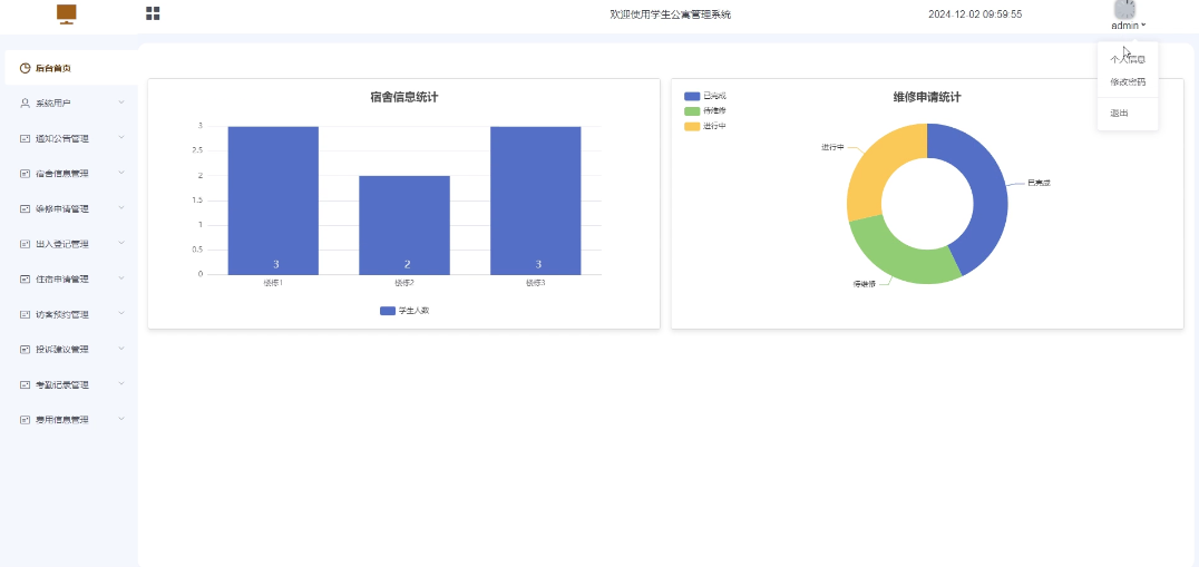 - 后台首页: 提供宿管用户登录后的管理首页,展示系统的重要信息和功能入口。