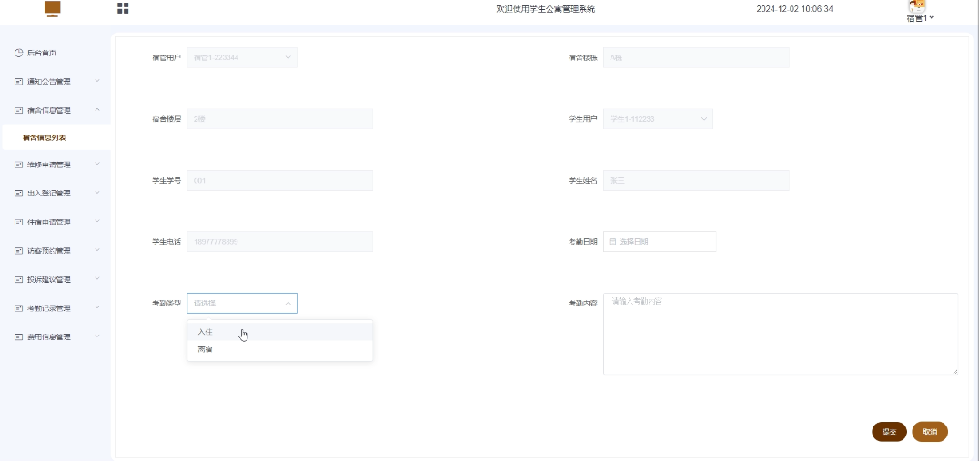 - 出入登记管理:宿管用户可以查阅学生用户提交给自己的出入登记信息。