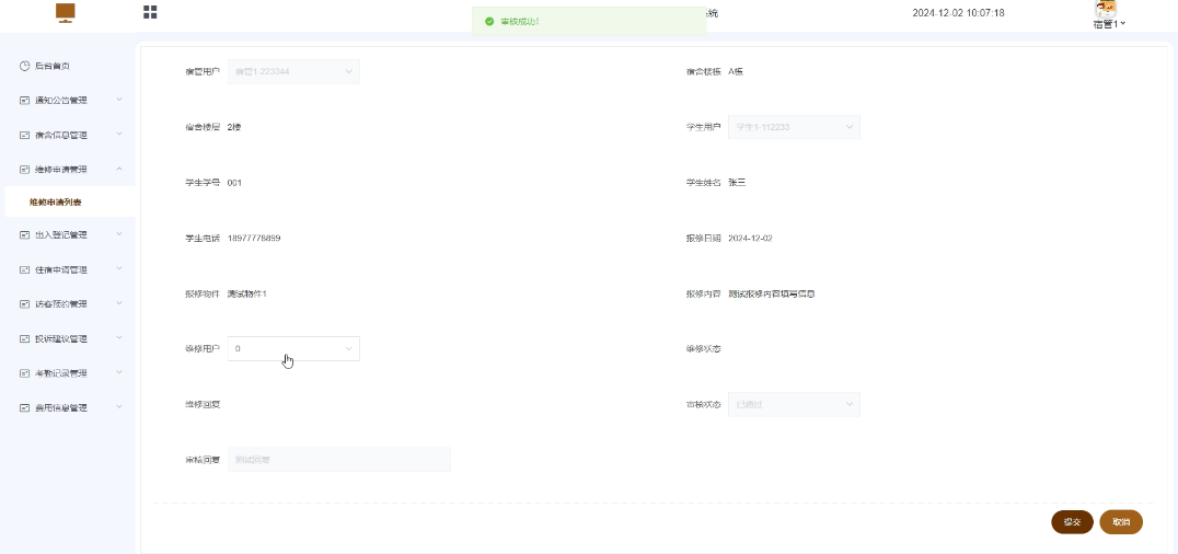 | TC005 | 验证维修申请审核功能 | 1. 登录宿管用户帐户。2. 进入维修申请管理界面。3. 点击审核,更新审核状态及回复。4. 点击提交。 | 维修申请审核成功,审核状态更新 | 与预期一致 |