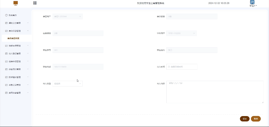 - 出入登记管理:学生用户可以查阅和添加自己的出入登记信息。