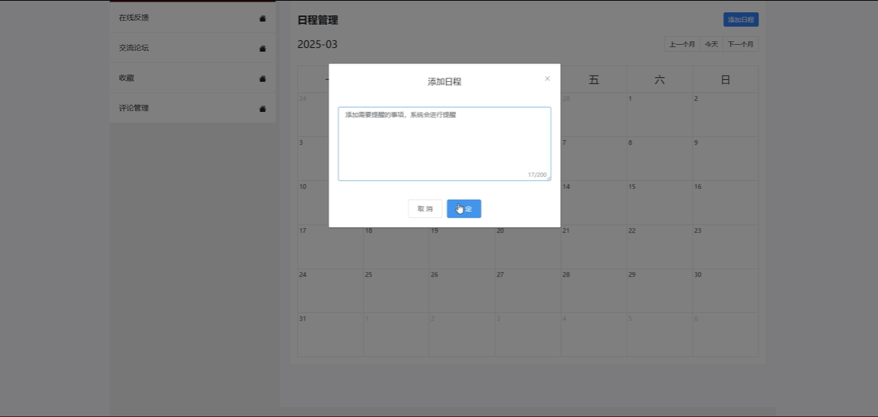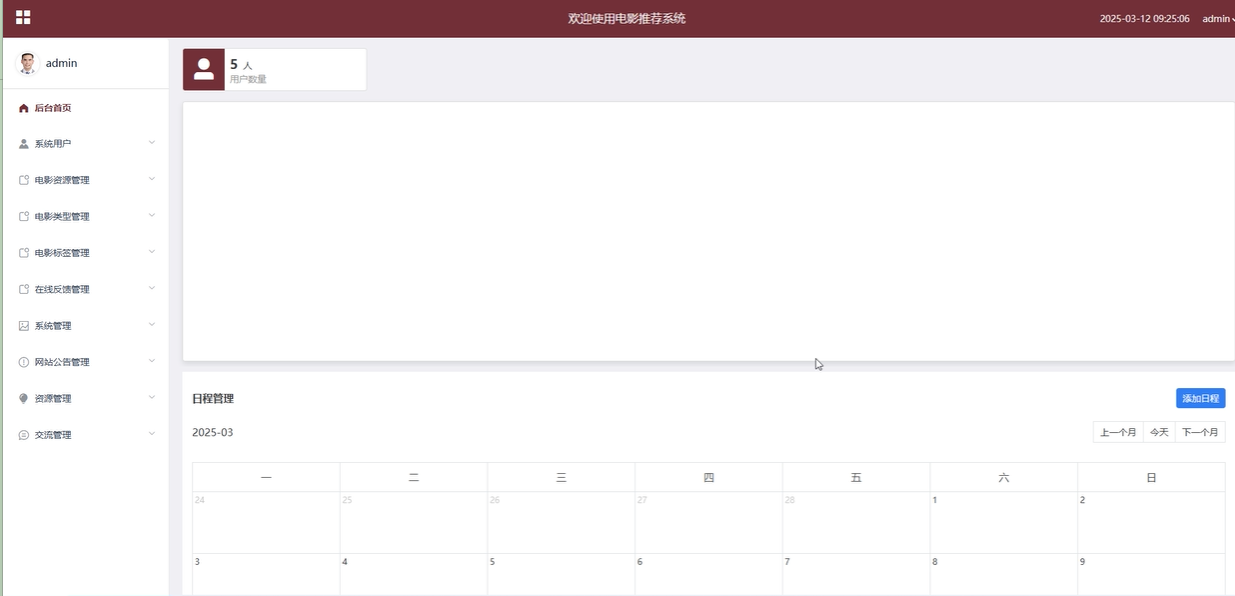 后台首页:后台首页为管理员提供了个人首页功能,包括日程管理和日历查看。管理员可以添加新的日程并查看当前的日程安排。此外,管理员还可以查看和管理平台的用户数量,实时了解系统的使用情况。