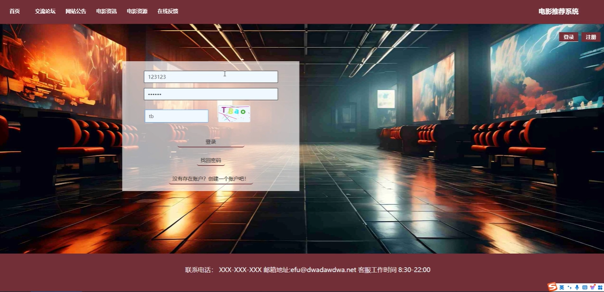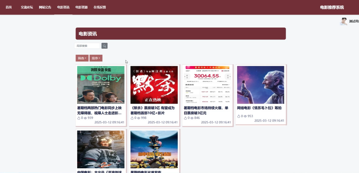首页:首页展示平台的轮播图、网站公告、电影资讯和广告信息等内容,用户可以通过首页浏览最新的电影资源推荐。首页通过协同过滤算法,根据用户的点击历史和偏好,优先推荐用户可能感兴趣的电影类型,提高个性化体验。